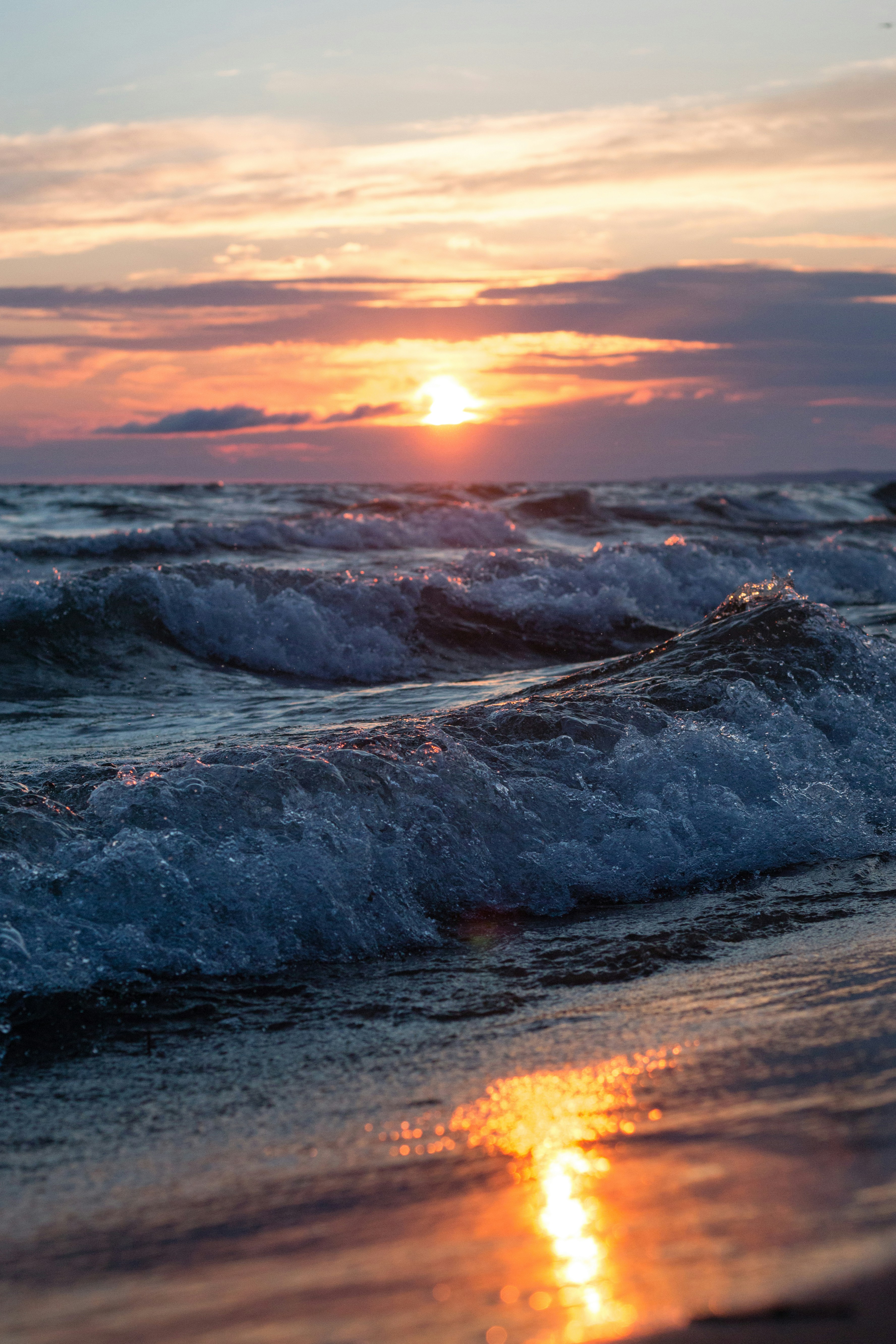 Waves in the paciifc ocean at sunset, in huntington beach, orange county, california. Seascape seashore sunset ocean waves beach purple sky horizon reflection coastline landscape scenery 5k 8k. California, sunset, dusk, sky, clouds, sea, ocean, seashore, waves, beach, sand public domain And foot prints in the sand on the north shore of oahu. This is a waterman's wave.